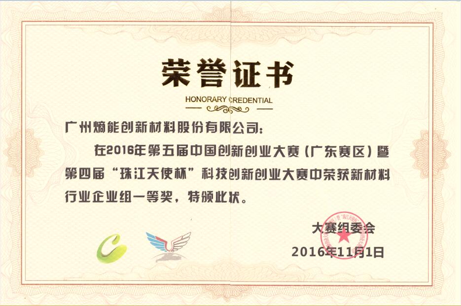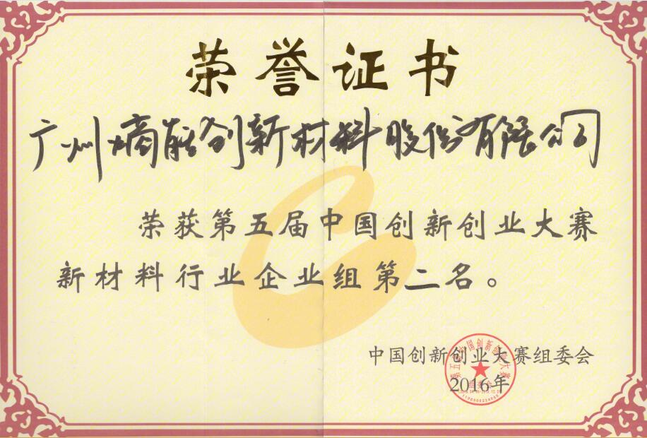 2016年公司的研发团队获得第五届中国创新创业大赛(广东赛区)暨第四届“珠江天使杯”科技创新创业大赛决赛新材料行业的一等奖