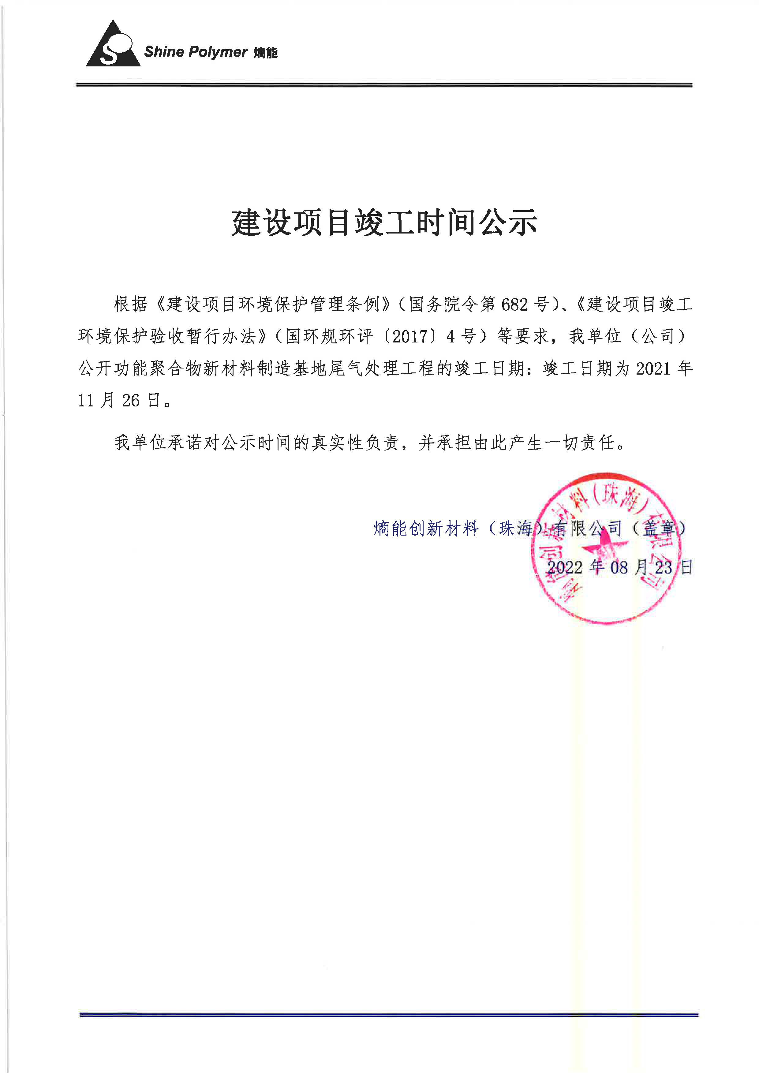 熵能创新材料(珠海)有限公司尾气处理工程竣工时间公示
